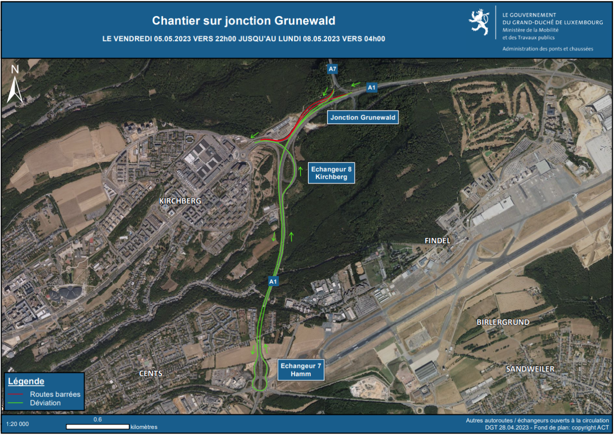 Both the A1 and A7 slip roads from Luxembourg City towards Kirchberg will be closed. Traffic will be deviated from the Grünewald via the A1 towards Luxembourg, via the Hamm/Sandweiler exit at the Iergäertchen roundabout, before rejoining the A1 towards Trier and the Kirchberg exit.