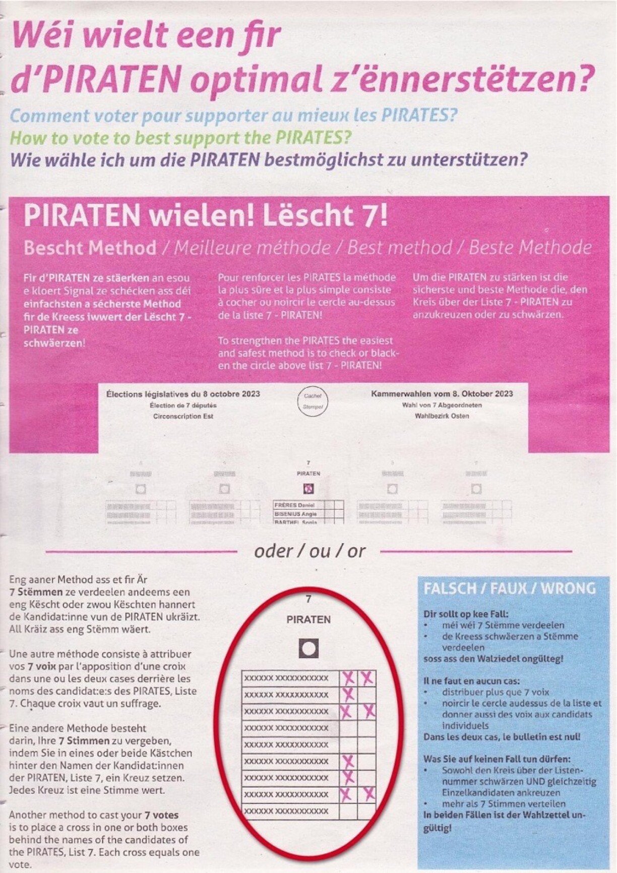 A recent attempt by the Pirate Party to explain to potential voters in the eastern constituency how to fill out their ballots seems to have misfired as too many boxes have been ticked on the exemplary ballot. While people have been advised to generally support the entire party by giving a vote to the complete list, the Pirates also wanted to demonstrate that individual politicians on their list can be supported.