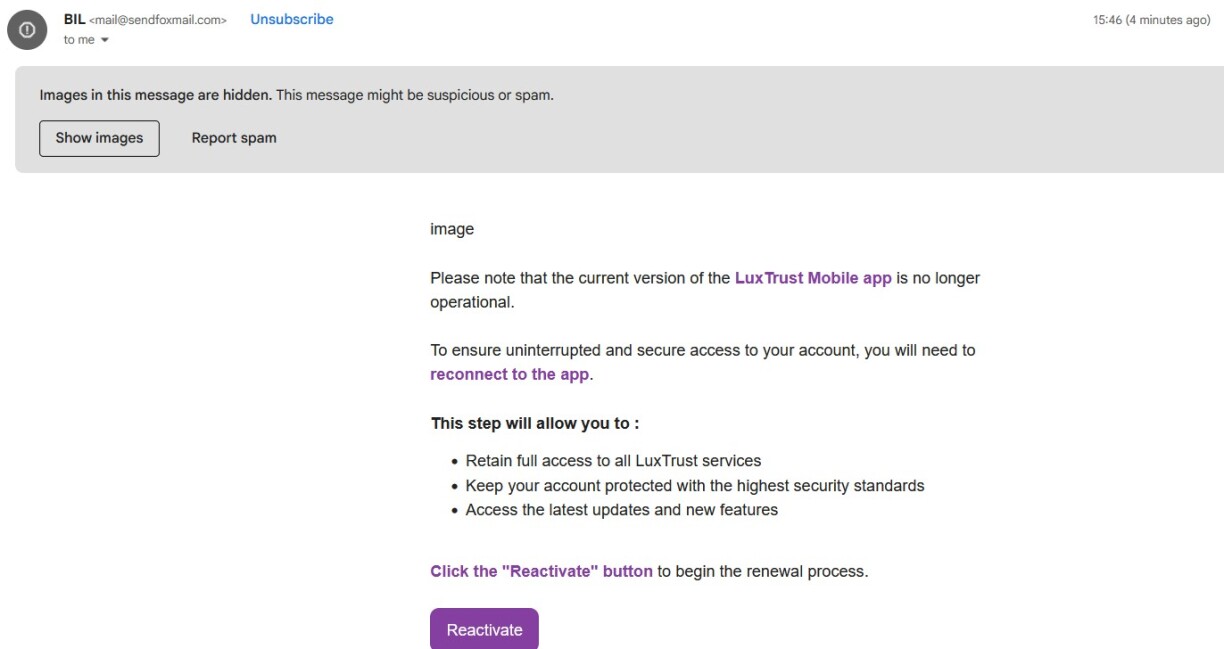 Email scams are also on the rise. A little tip in case of doubt: emails from reputable organisations like banks, the police, or other official bodies always use verified addresses such as info@banque.com or info@police.lu. In this case, the email address used by the scammers did not match the bank’s recognised security standards.