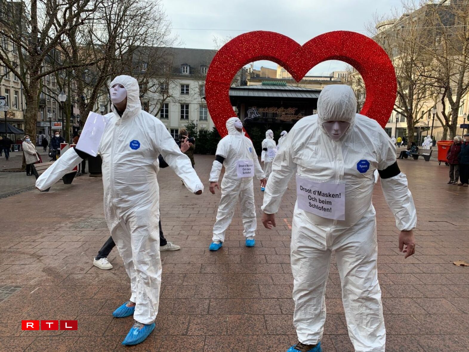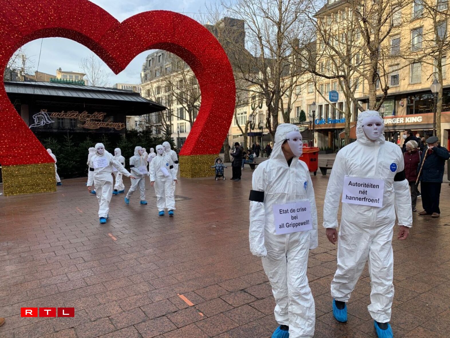 Dressed in full protective gear and carrying statements such as ‘let yourself be vaccinated’ and ‘cash makes you sick’, the demonstrators filed through Place Guillaume II in the capital.