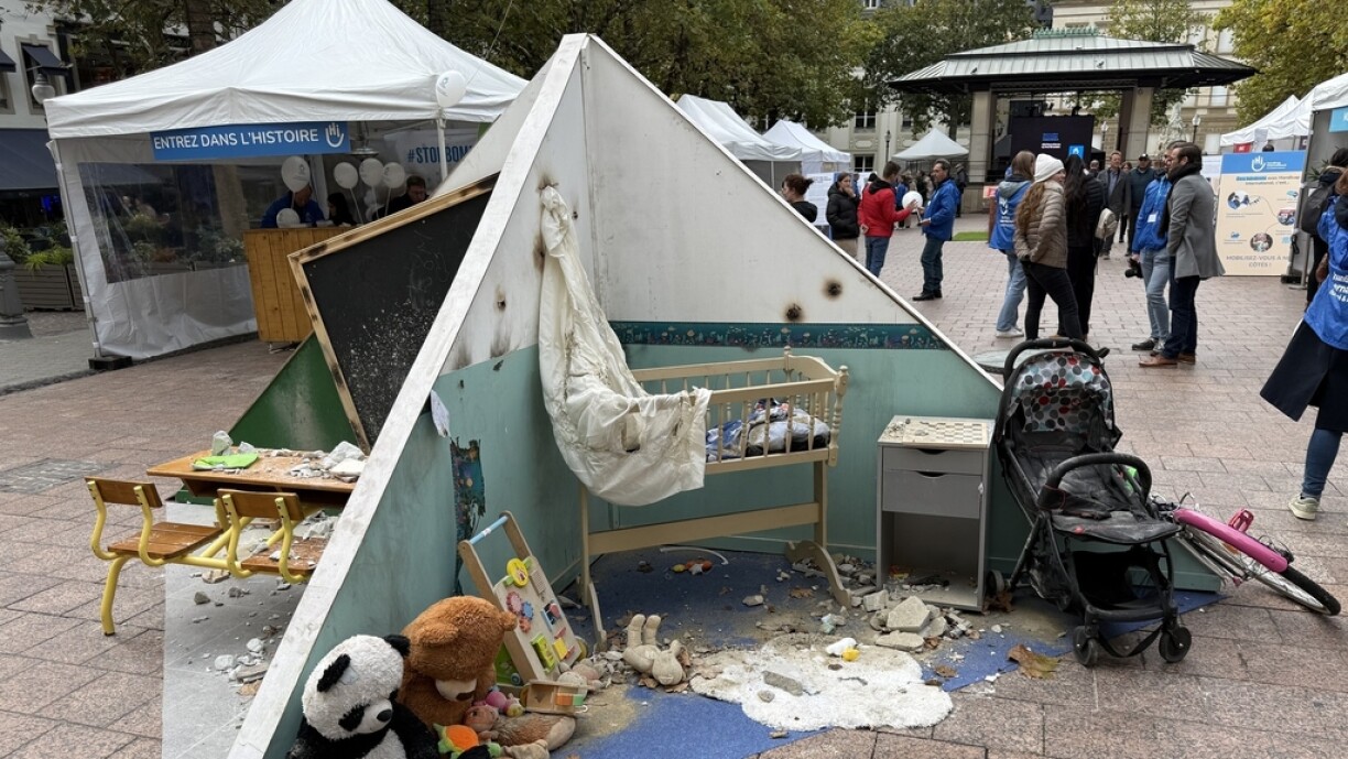 The installations were set up by the NGO Handicap International to highlight the devastating impact of bombardments on civilian populations. The event aimed to raise awareness about the increasing number of civilian casualties caused by bombs in conflict zones which tragically doubled last year compared to 2022.