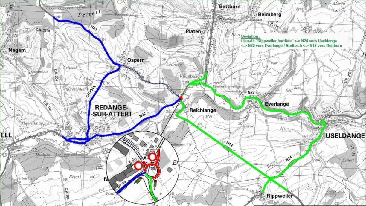 The new roundabout in Reichlange will link the national roads N12/N22 and N23. In order for the construction to proceed as planned, Rue de Bettborn (N12) and Rue d’Ospern (N23) will be closed.