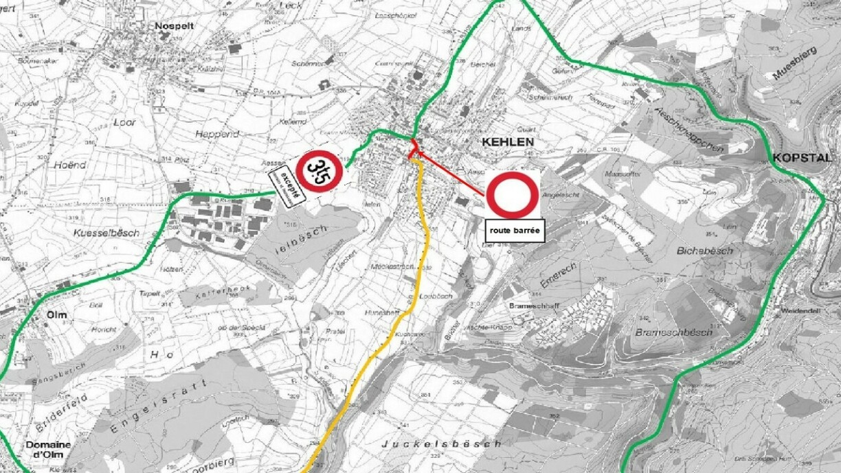 Traffic will be diverted via Olm. Vehicles over 3.5 tons traveling between Mamer and Quatre-Vents will be rerouted in both directions via Kopstal. Traffic from the Kehlen industrial zone (ZAE) will also need to follow the Olm–Mamer detour, as passing through Kehlen will not be possible.
