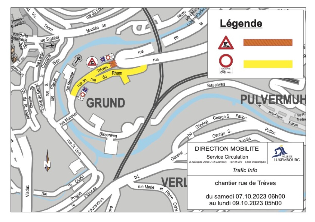 The City of Luxembourg has announced an upcoming road closure due to maintenance works on the bridge junction at Rue de Trèves. The maintenance is scheduled to take place from Saturday, 7 October at 6am to Monday, 9 October at 5am.