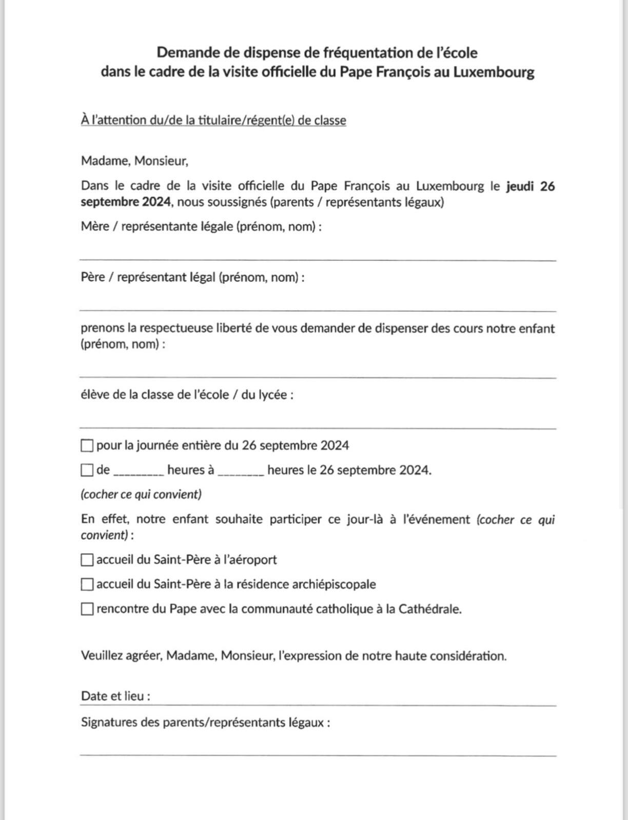 Schoolchildren who are eligible to participate in an official event to see the Pope may receive special dispensation to have a day off school in order to do so. Parents may request a full or partial day off school for their children, provided they have completed the necessary forms.