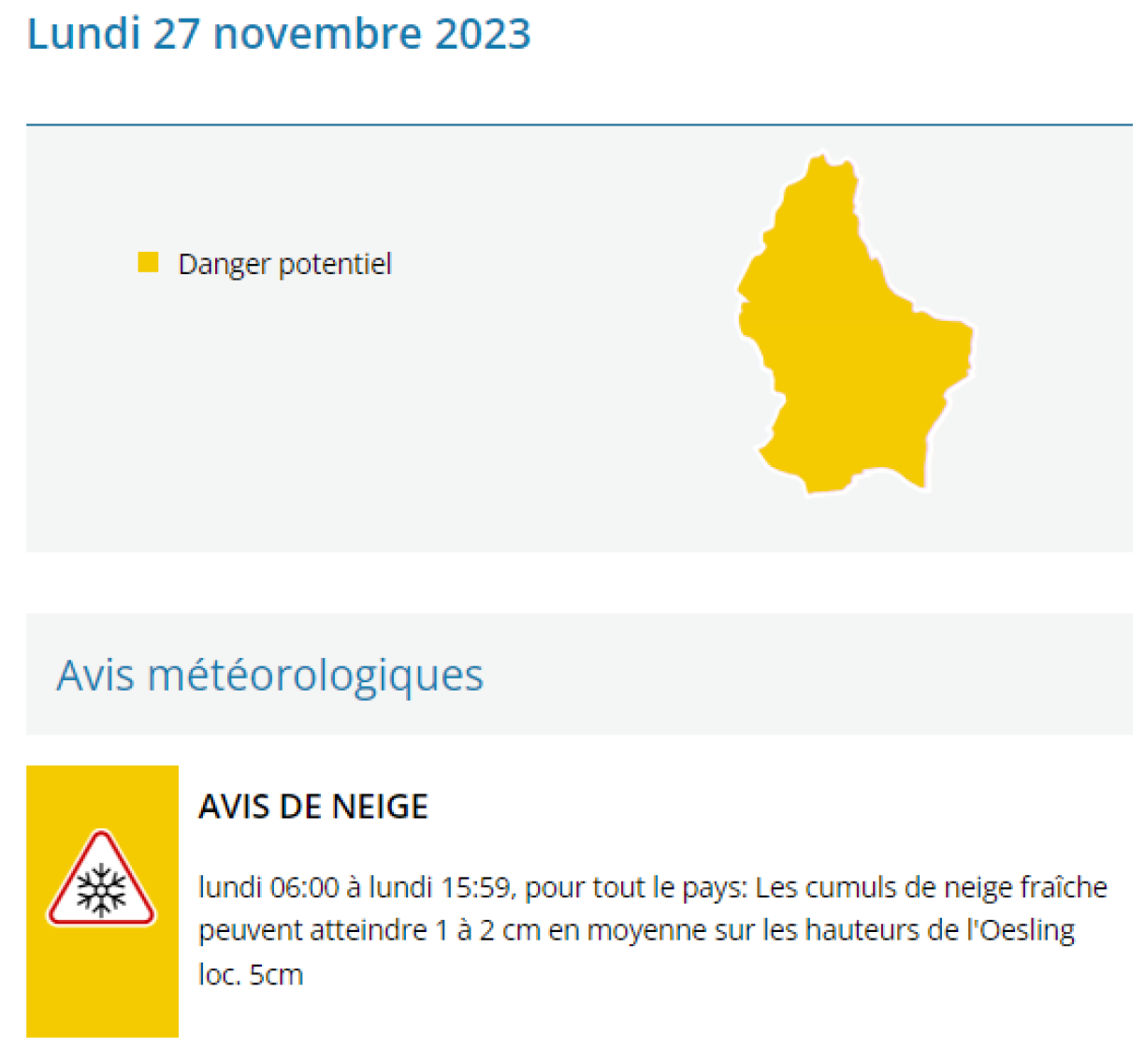 This Sunday afternoon, Meteolux issued a yellow alert for Monday, effective from 6 am to 4 pm. Anticipated snowfall in the Eislek region is expected to range from 1 to 2 centimeters for most areas, while some locations may experience up to 5 centimeters.