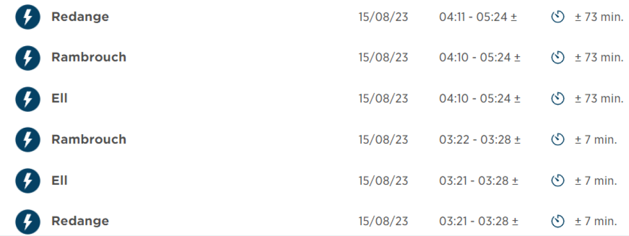 Redange, Rambrouch and Ell suffered power cuts from 3.21am until 5.24am on Tuesday morning following thunderstorms overnight. The issue was initially resolved within seven minutes, according to Creos, but the power dropped once again at around 4.10am for 73 minutes.