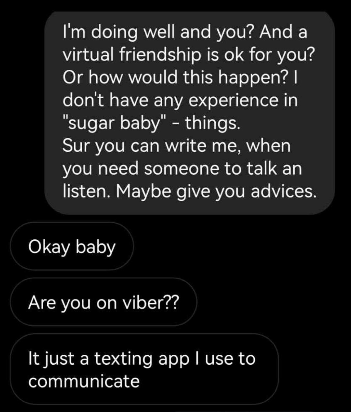 Initially, Anouk and the so-called sugar daddy exchanged only a handful of messages via Instagram before moving the conversation to the messenger app Viber. Once Anouk shared her contact details, the scammer exclusively made contact via the new app.