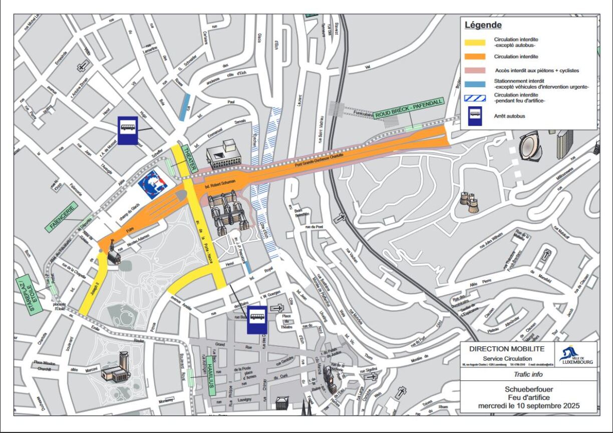 In preparation for the pyrotechnic show, the Luxembourg City municipality has announced road closures. Access to the Limpertsberg neighbourhood from the Robert Schuman roundabout will be prohibited from 8pm until approximately 11.30pm. Alternative access will remain available via Rue des Glacis, Rue Albert Unden, and Avenue de la Faïencerie from the Rollingergrund side.