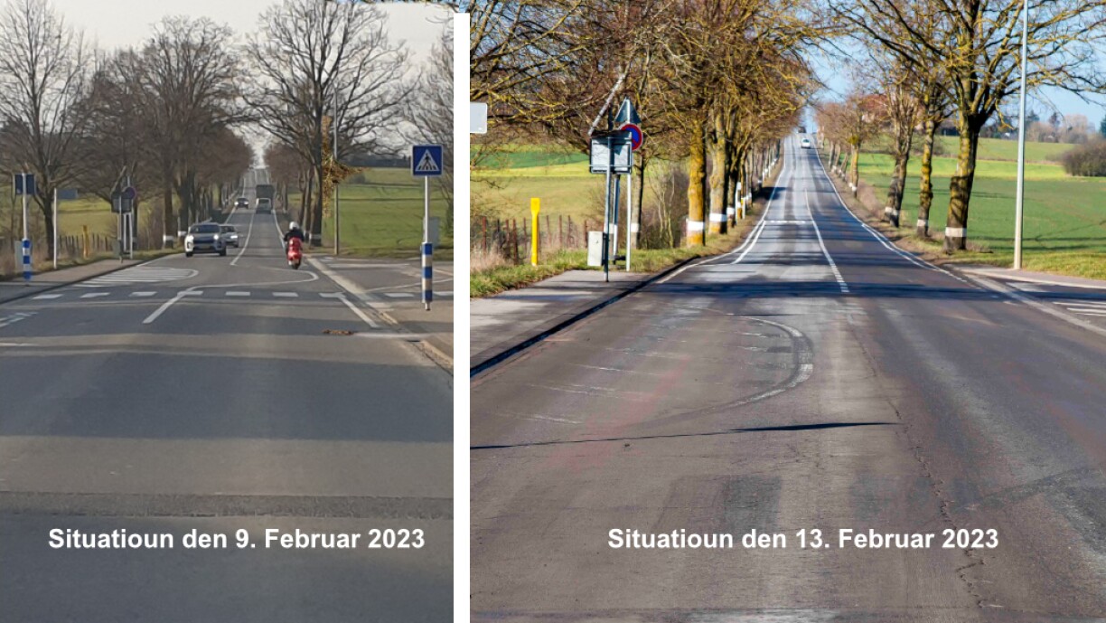The line in the middle of the road has a significant curve and thereby forces motorists coming from Huncherange to briefly drive at the same level as the rest of the opposing lane, with the latter having been diverted even further to the side.