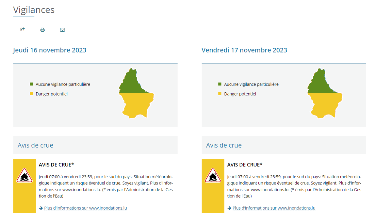 “The weather situation indicates a potential flood risk,” Meteolux wrote on Thursday, warning residents to exercise vigilance and to check the water management administration’s flooding website for further details.