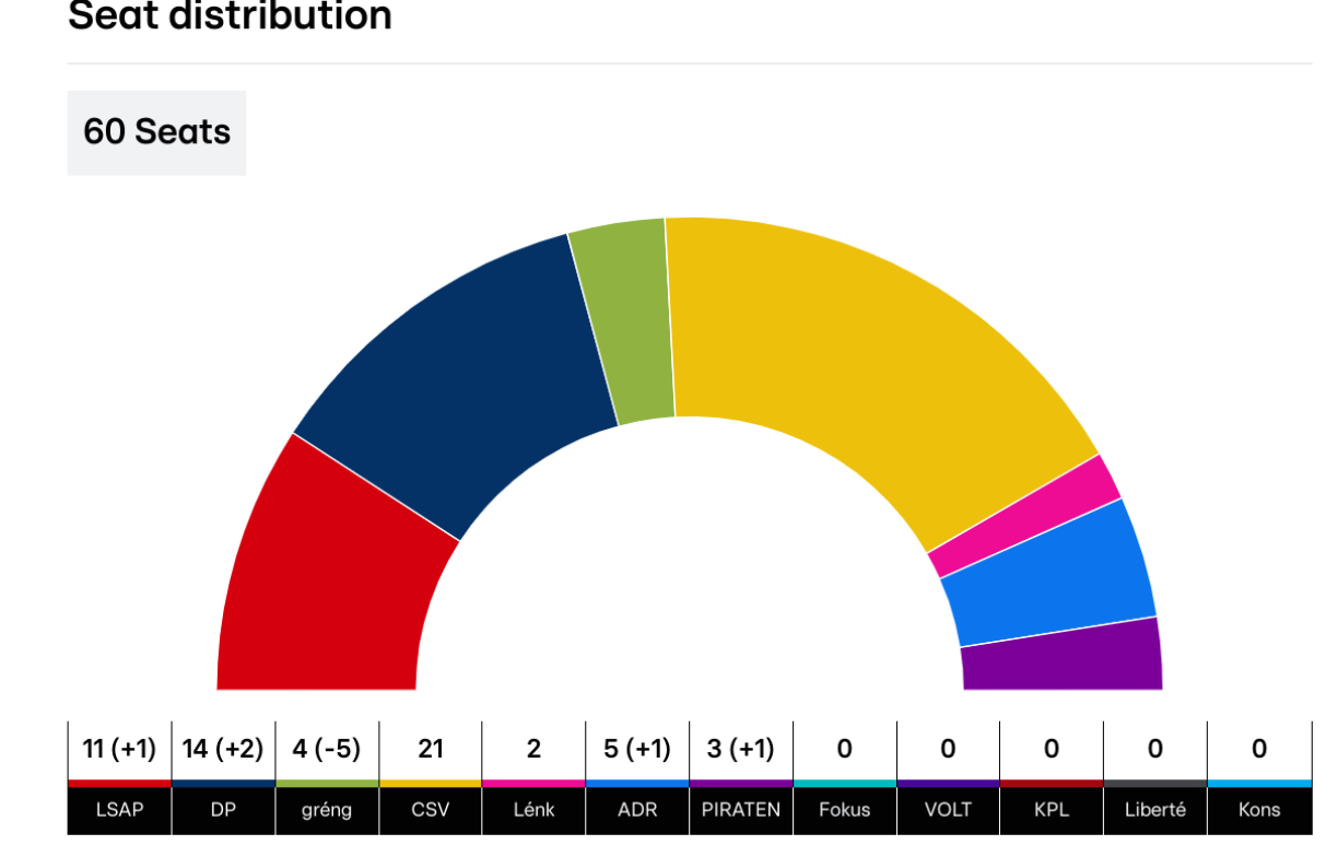 he CSV currently holds enough seats to potentially form a coalition with either the DP or the LSAP. The Democratic Party, following a decade in power, garnered additional support, securing two more seats in parliament. This elevation places them as the second-strongest party in the nation, boasting a total of 14 seats. Meanwhile, the LSAP also experienced a modest gain, obtaining one additional seat, though their overall count stands at 11.
