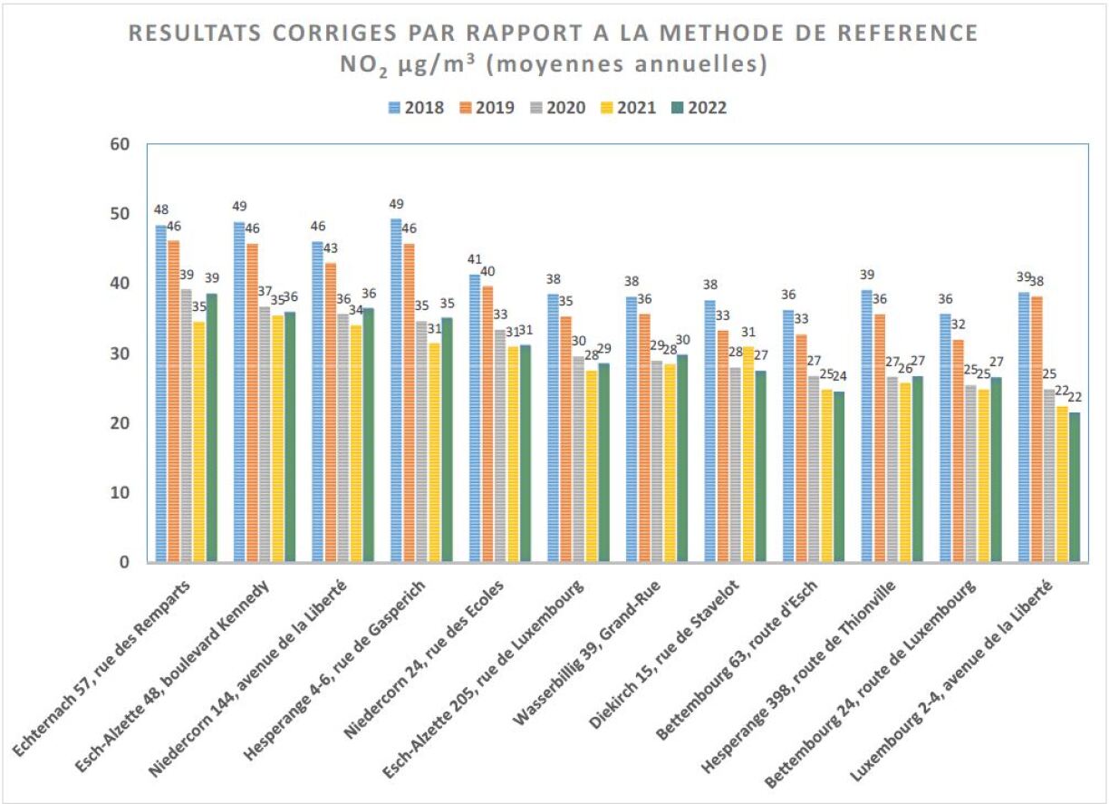 The first piece of good news is that no location exceeded the 40 µg/m3 limit in 2022. However, not all communes are on the same level, and several “display values very close to the limit value, notably in Remich, Echternach, and Differdange, but also in Esch/Alzette, Hesperange, and Luxembourg City.”