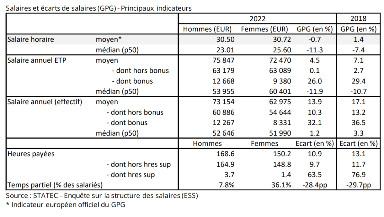 Statec calculated the indicator based on a common European methodology established by Eurostat, which represents the gap between men’s average gross hourly wage of men and that of women, as a percentage of the men’s average. A positive figure therefore indicates that men earn a higher average salary, while a negative figure means that women earn a higher average wage.