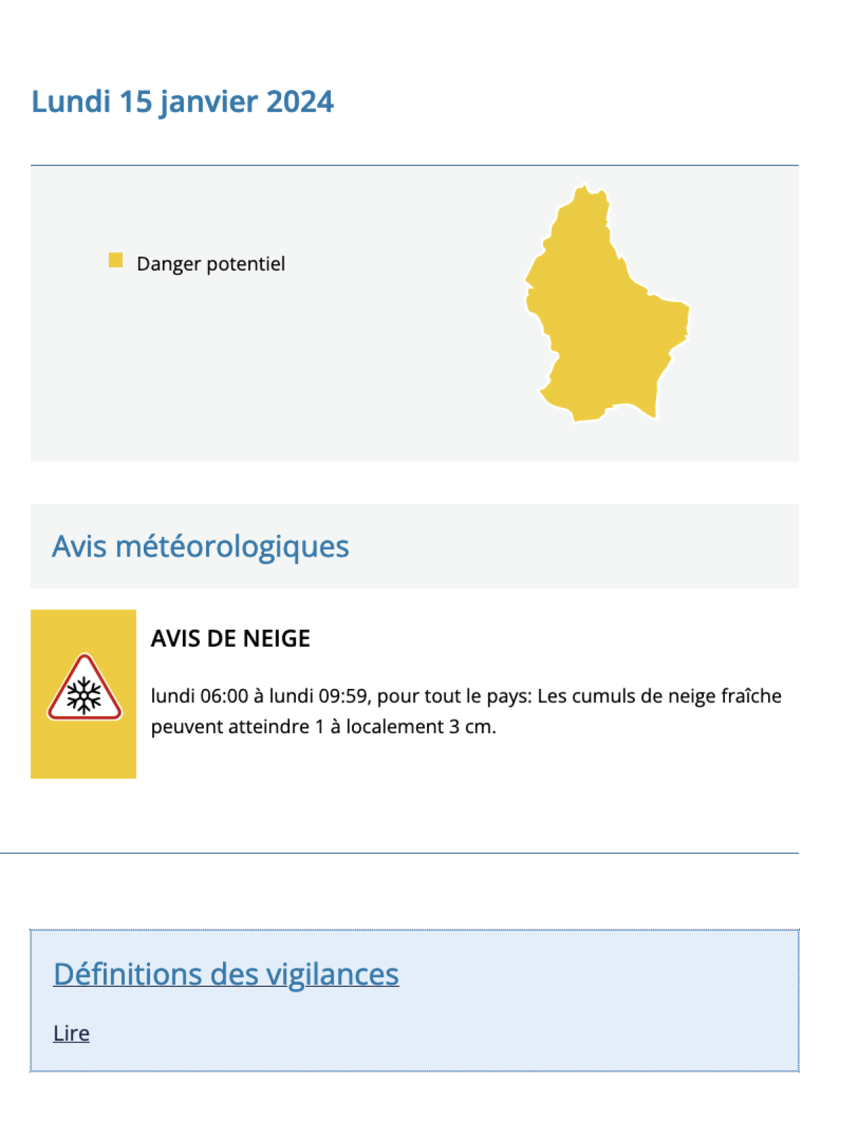 According to MeteoLux, up to 3cm of snow might fall in Luxembourg on Monday. The meteorological service has therefore issued a yellow alert, which will in place from 6am to 10am across the entire country.