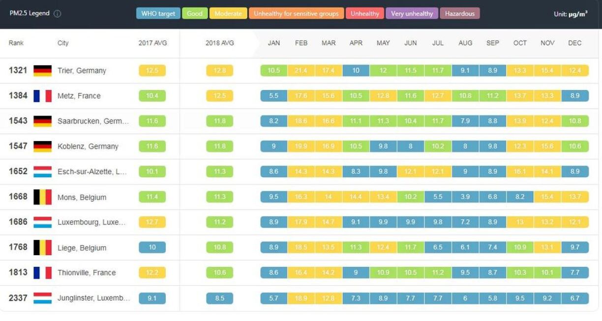 A score of up to 12.0 is considered “good”, while 12.1-35.4 is “moderate”. We looked at the three cities/towns in Luxembourg included in the study, as well as a few nearby cities in Belgium, France, and Germany. The below graphic is sorted according to the 2018 average, and a higher placement in the list means more pollution. The “rank” on the left indicates each city’s worldwide pollution ranking.
