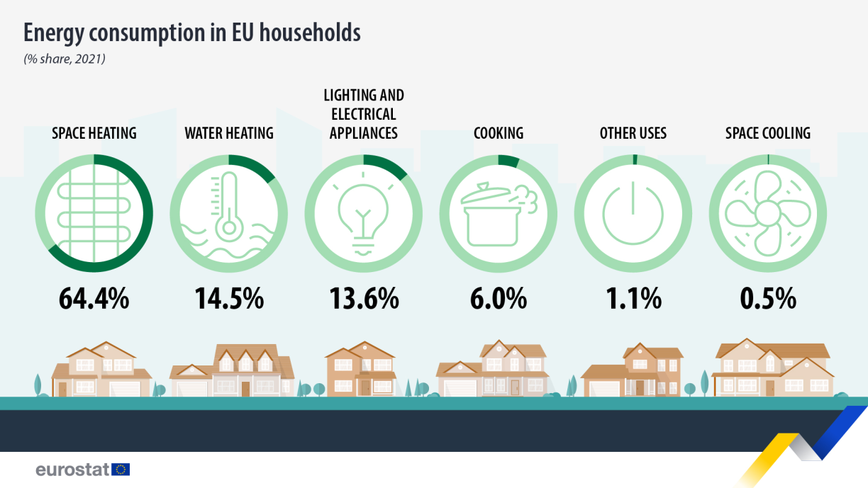 The largest proportion of household energy consumption was attributed to home heating, consuming 64.4% of the final energy, followed by water heating at 14.5%.