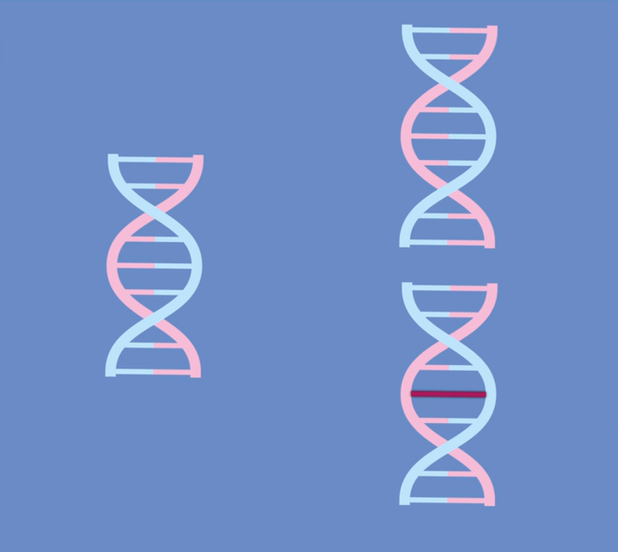 On the left: intact DNA. Top right: intact DNA; bottom right: defective DNA. During DNA replication, an error (mutation) occurred, represented here in a simplified form by a red line.