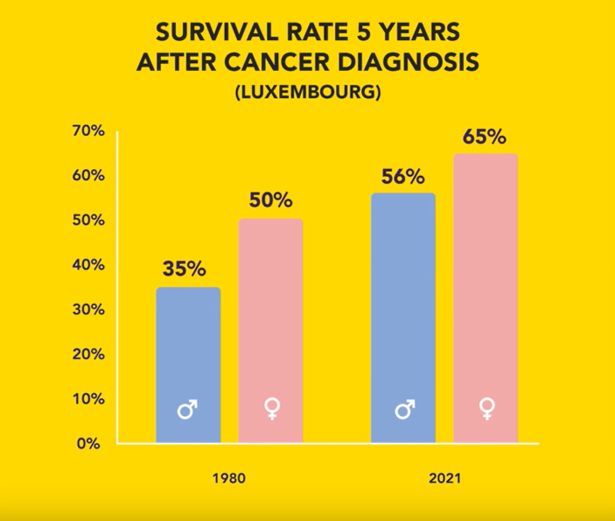 Survival rate 5 years after a cancer diagnosis in 1980 vs. 2021 in Luxembourg. Source: Mafra et al. (2021)