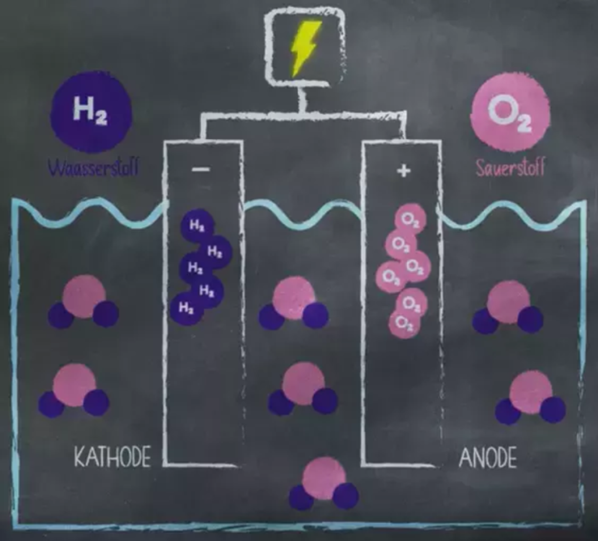 Most importantly, it can be produced in an environmentally friendly way. Maybe you remember the reaction from school: through electrolysis, water is split into hydrogen and oxygen using an electric current.
