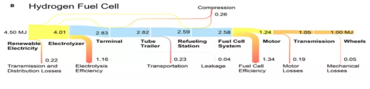 However, taking the hydrogen route means you need 4.5 megajoules to get just one megajoule of usable energy on the road. This means almost 80% of the initial energy is lost.