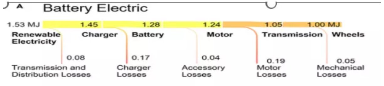 If we put it in numbers: to get 1 megajoule of energy to the wheels, you need about 1.53 megajoules to start with. So roughly a third of the energy is lost.