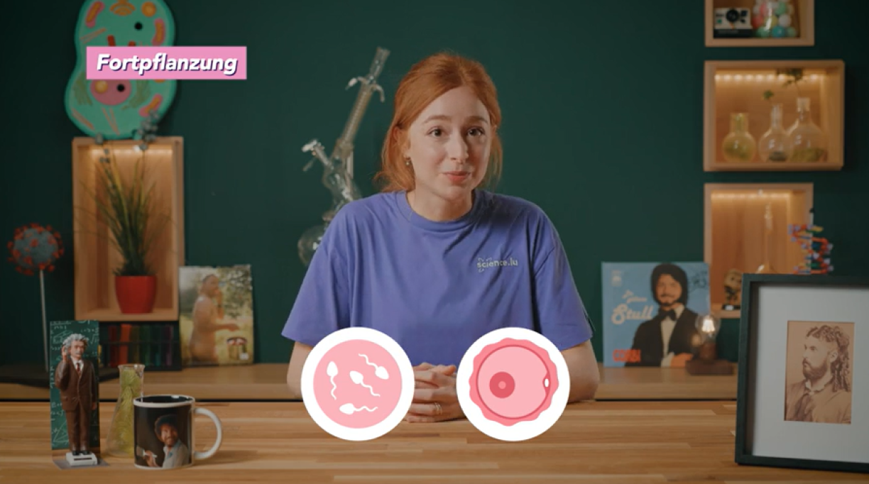 Still from the video showing pictograms of sperm (on the left) and an egg cell (on the right). The presenter is Lucie Zeches from the Luxembourg National Research Fund (FNR).