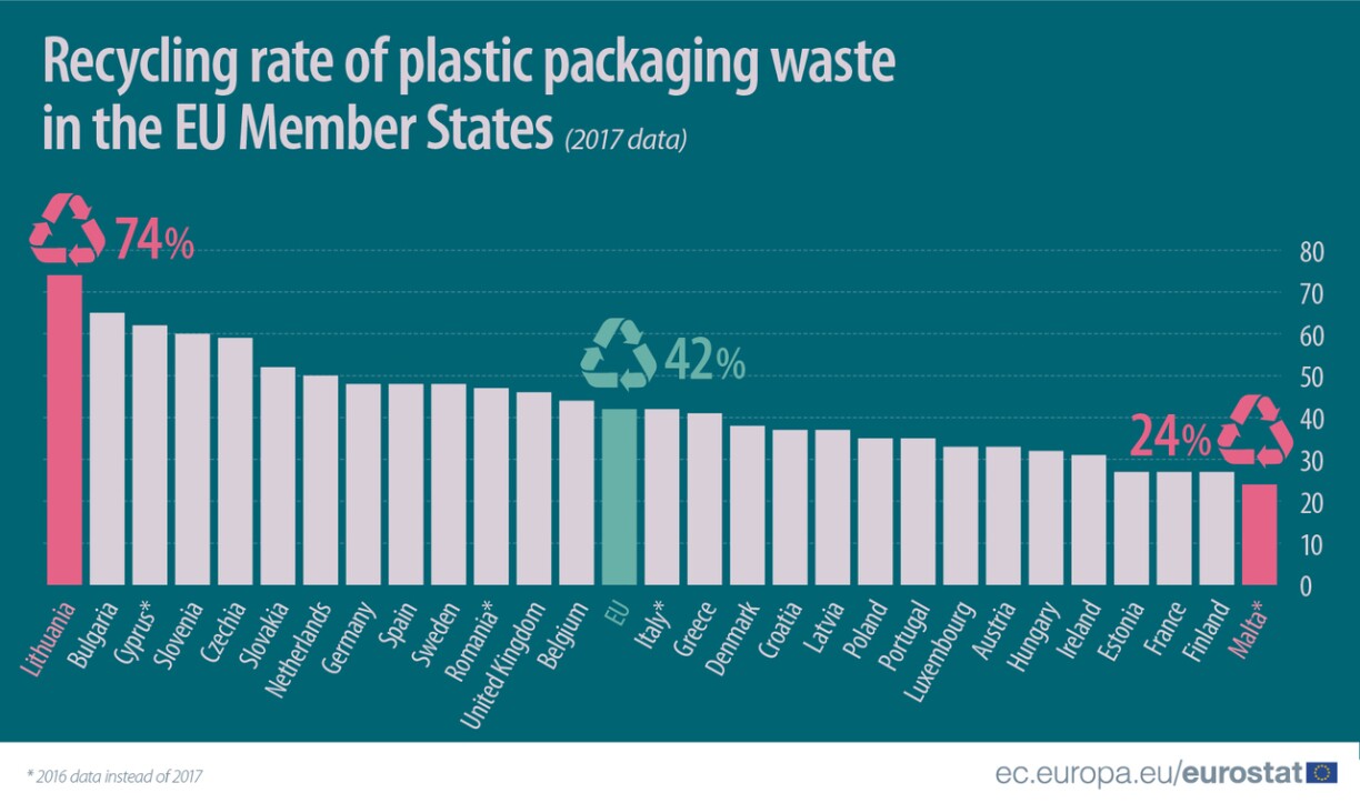 The EU as a whole recycles 42% of plastic packaging waste generated, with Lithuania leading the way at 74% — followed by Bulgaria (65%), Cyprus (62%), Slovenia (60%), and Czechia (59%).