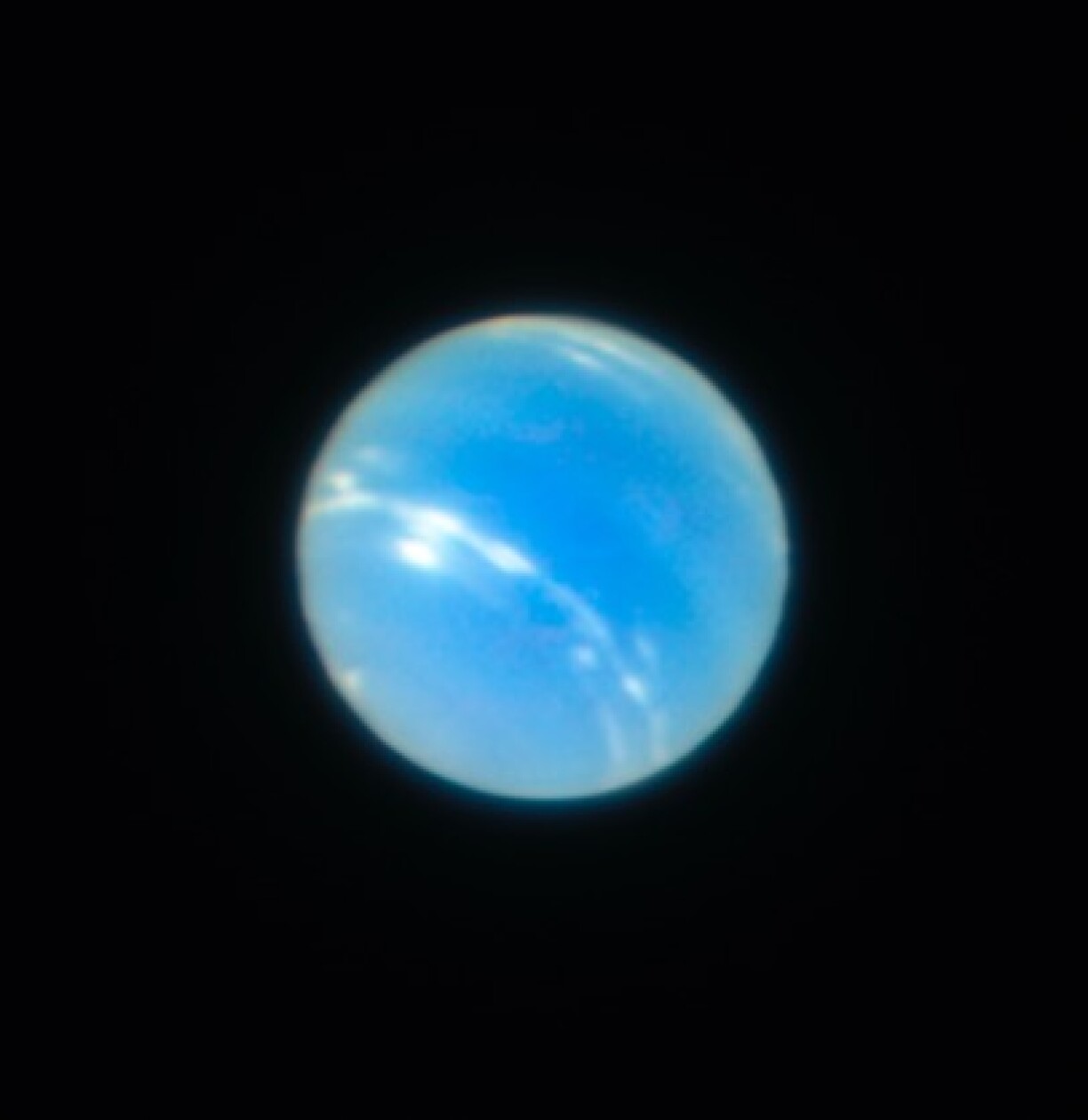 The name was a clear reference to the planet’s vivid blue tint, that at the time was thought to be due to liquid water floating on the planet’s surface. However, while there is in fact a mix of water, ammonia, and methane ices on the surface (hence the appellative Ice Giant), Neptune’s blue colour is the effect of the small amount of methane present in its atmosphere, which absorbs red light and reflects blue light outward.