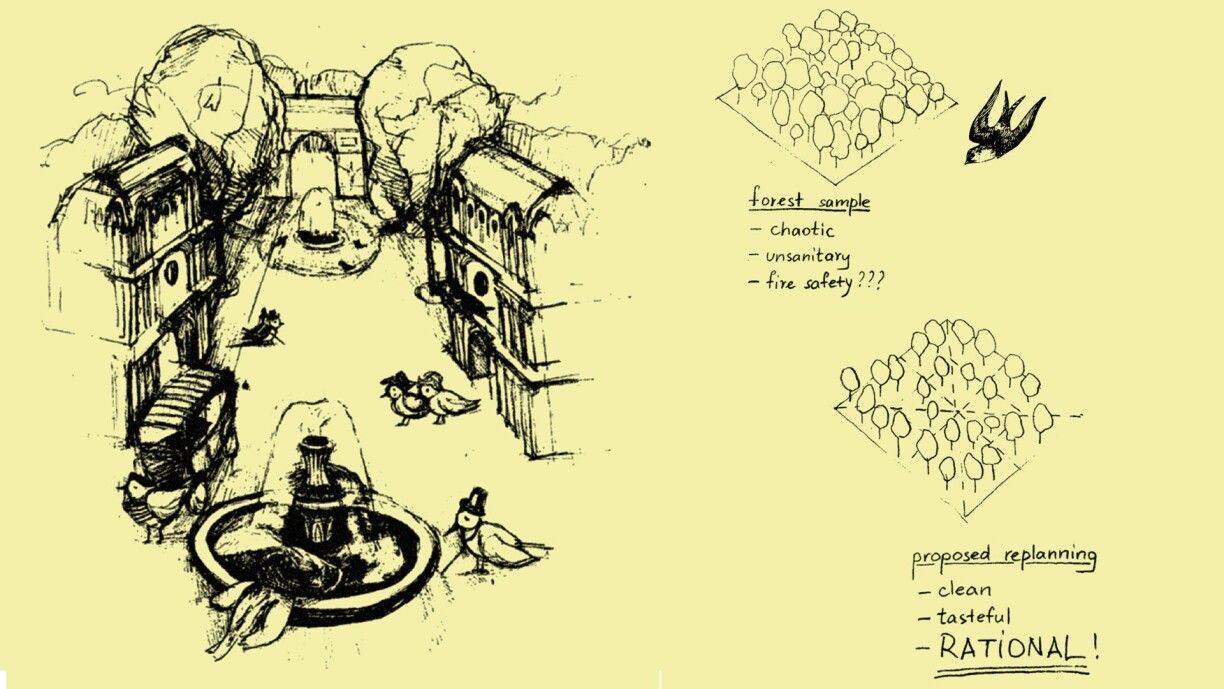 Look at these trees, haphazardly scattered about, standing far too close to one another, competing for light, erm… made out of wood? Fire hazard! Unsanitary! How can such a place not turn into a den of vice and sedition? A dwelling fit only for beasts, I tell you... But the times are medieval no more, so grab a ruler, a chainsaw, and get ready to shine in this mess the holy light of reason.