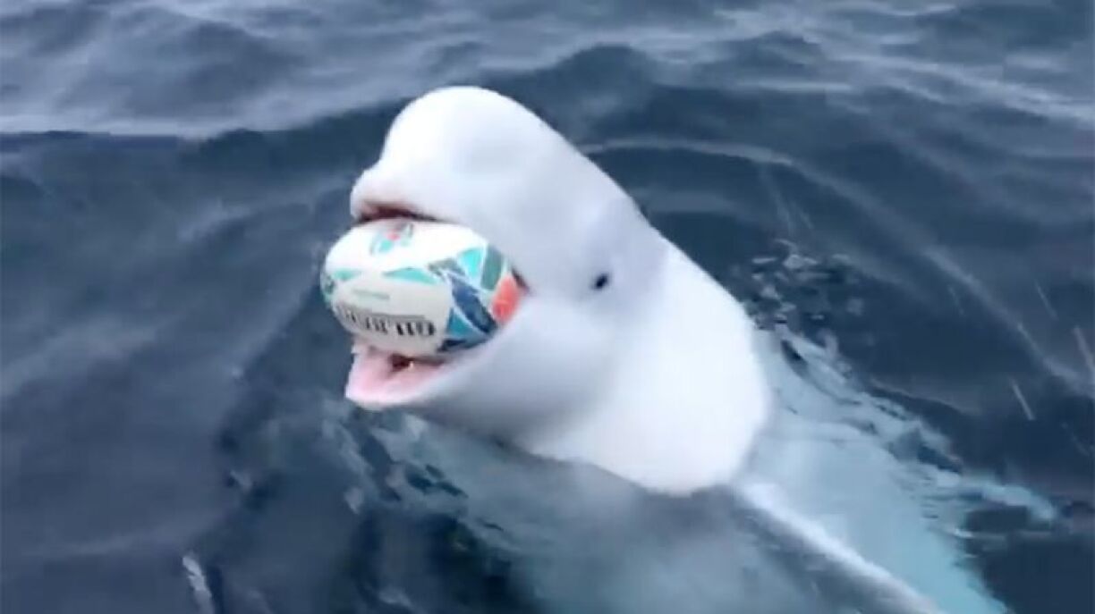 As one of the crew members lobs a rugby ball out into the water, the beluga speeds off to bring it back and go again.