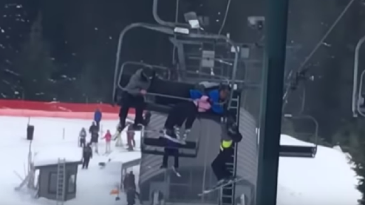 Unfortunately he didn’t manage to get seated correctly, leaving him dangling off the side as the chair continued to rise up the lift route.