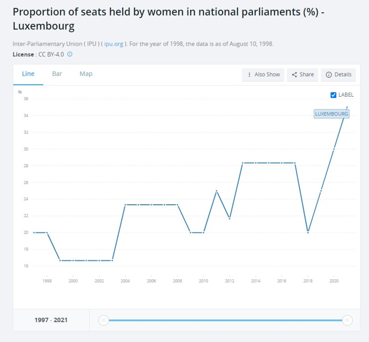 On a more positive note, when we look at the development of the number of seats held by women in national parliaments since 1997, we see that there’s been a gradual increase, in particular from 2018-2021 when the number of seats occupied by women jumped from 20% to 35%.