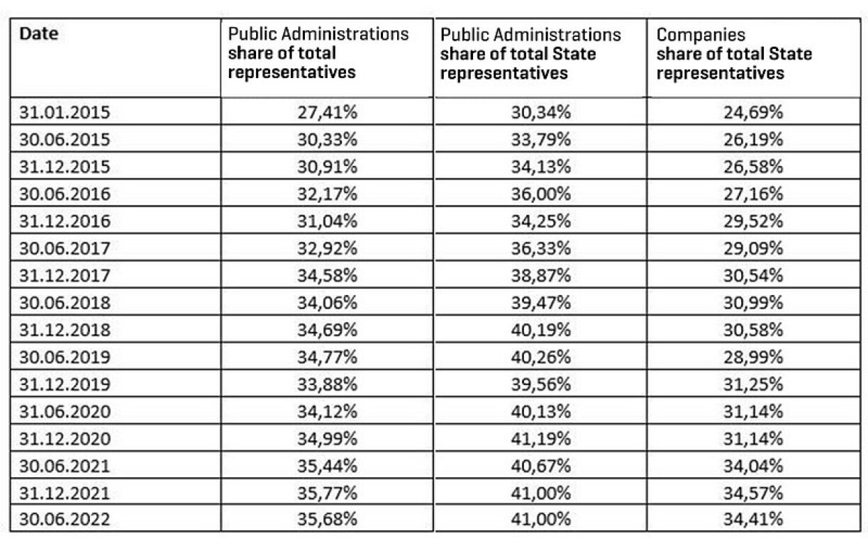 Although the quota for state representatives on the boards of public institutions has been reached (41% in June 2022), the figure for state representatives on the boards of private companies drops to 34%.