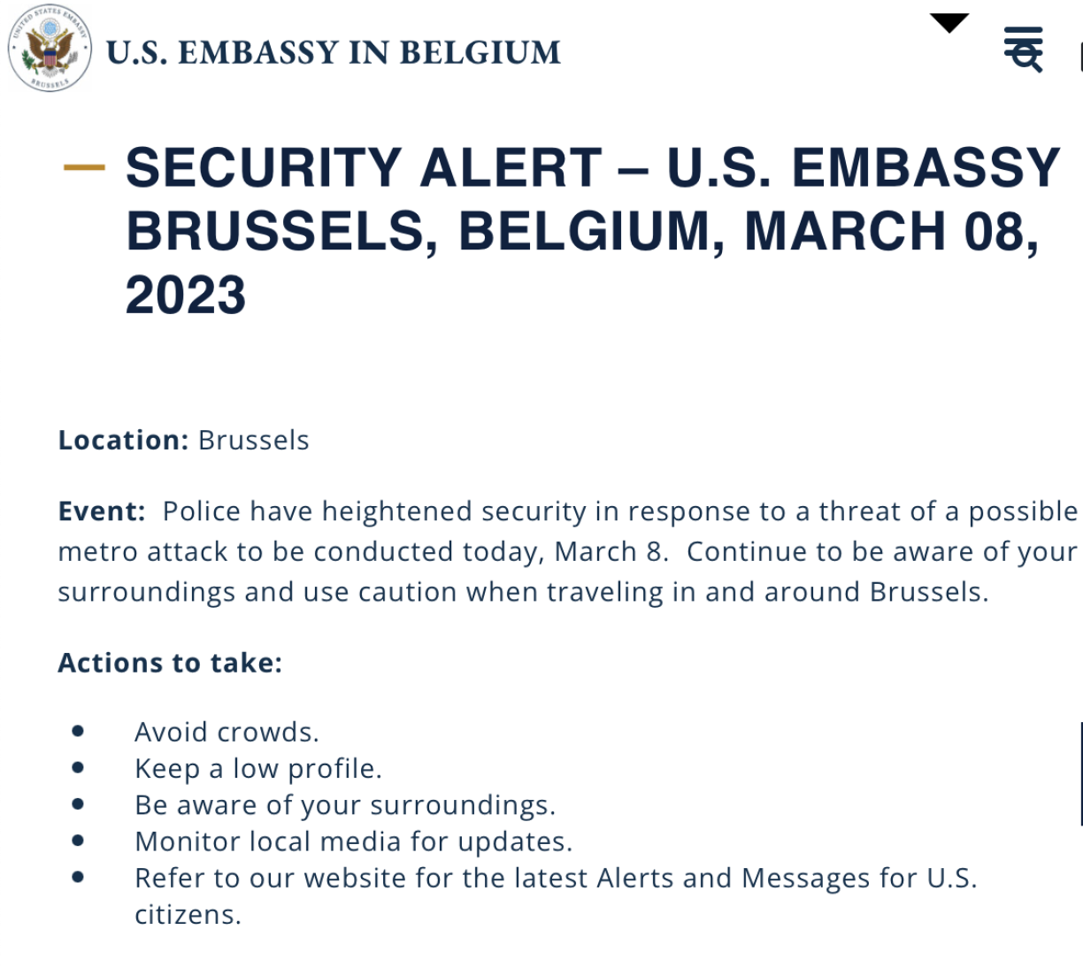 The US Embassy in Belgium issued its own security alert, calling on US citizens in Brussels to take extra precautions.