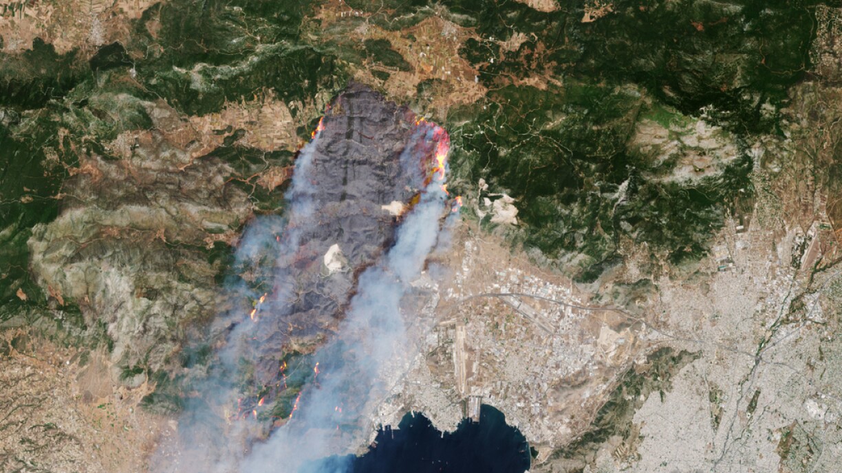 Images taken by the European Space Agency (ESA) as part of the ‘Copernicus Sentinel 2' mission clearly show the movement of flames towards the coast, alongside developing plumes of smoke.