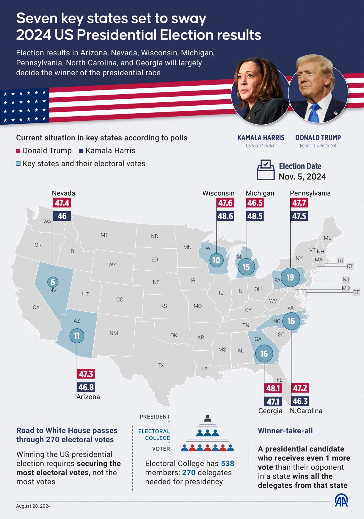 Both campaigns are expected to focus heavily on these states, as their electoral votes are crucial for either candidate to reach the 270 electoral votes needed to win the presidency.