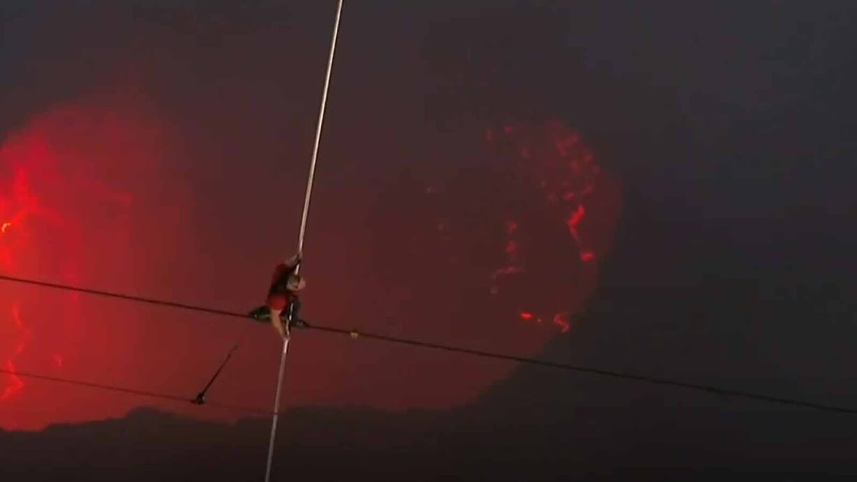 Wallenda walked tightrope across a crater of an active volcano that has become known as “The Mouth of Hell.” The imaginative name of the crater speaks volumes: the boiling lake of lava spews toxic gases. Wallenda had to wear goggles and a respirator for protection from the hazardous gases - but he removed the googles halfway through the nail-biting stunt.