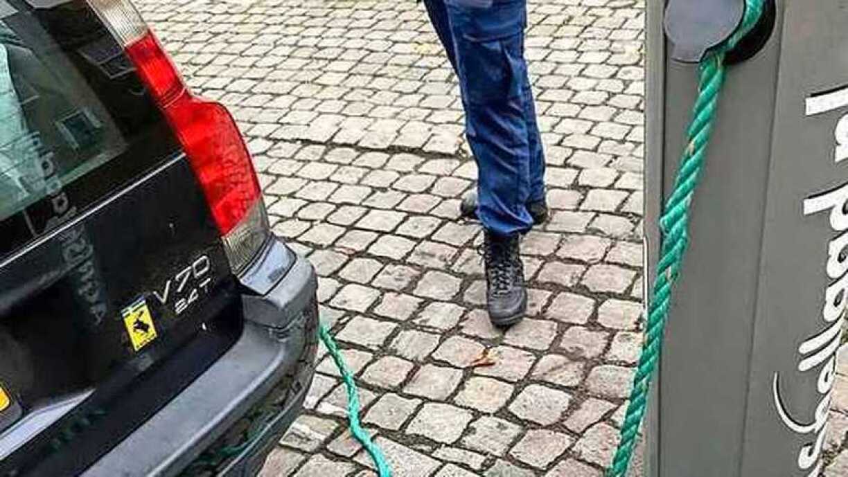 According to parking regulations, you can only park at a charging station if you actually use it to charge your car. So a non-electric car can never legally park there, but said driver thought he had found a solution. A green cord between his tank lid and the charging station was supposed to fool the regulators.