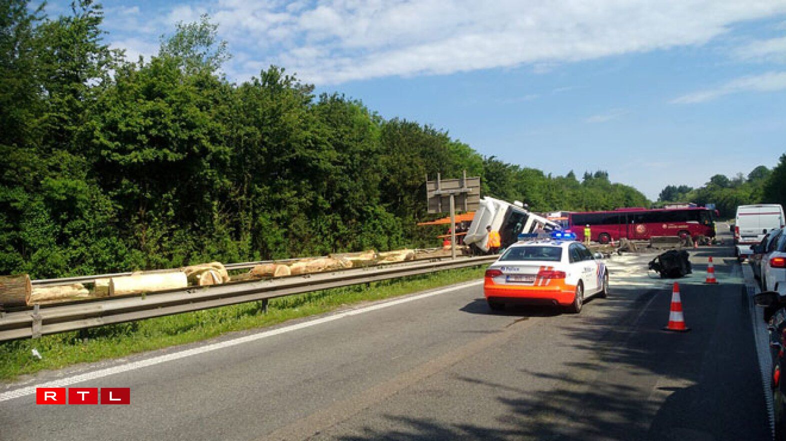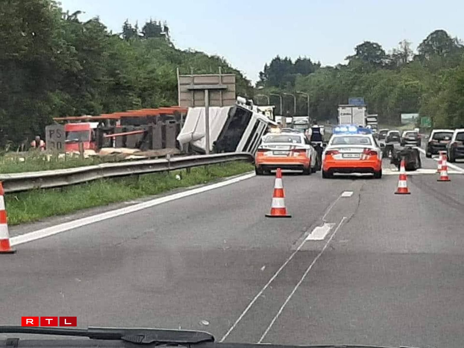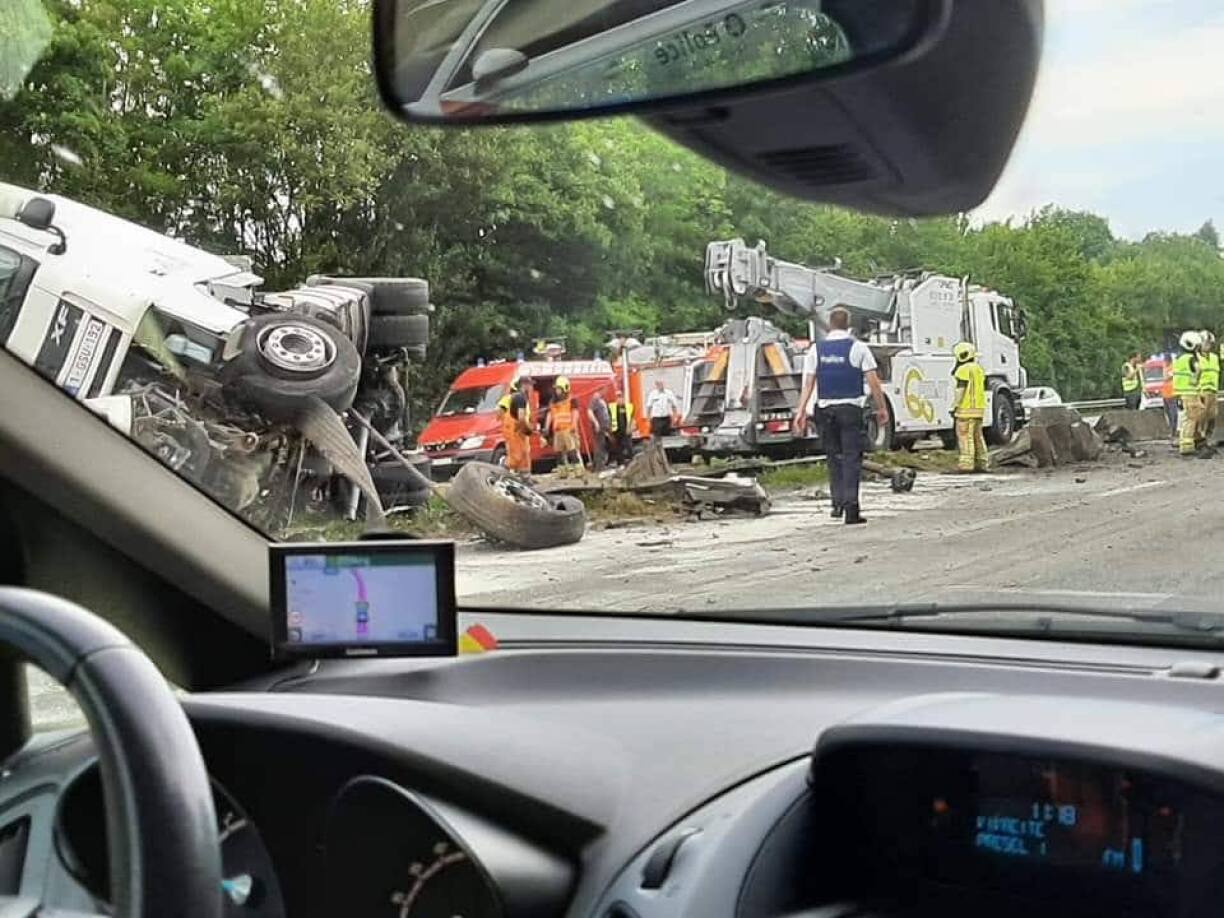 According to our Belgian colleagues, the heavy goods vehicle crossed the central median before tipping over and landing on its flank.