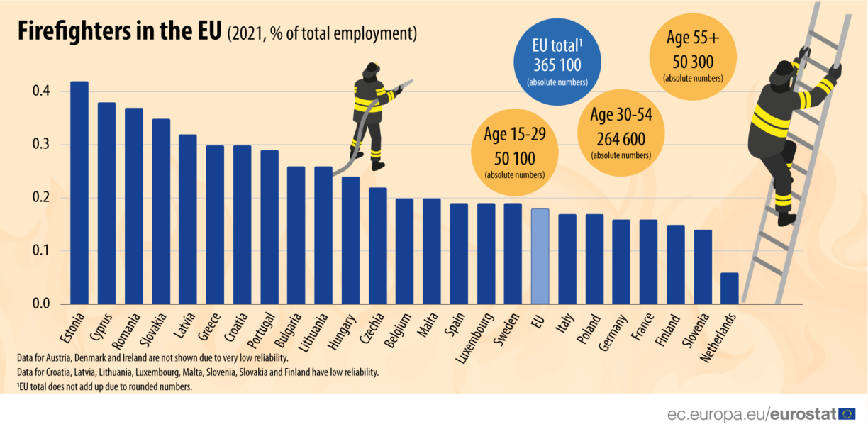 Eurostat made it its mission to take a closer look at firefighters in the EU. In 2021, about 365 thousand people were employed as professional firefighters, representing 0.2% of total EU employment.