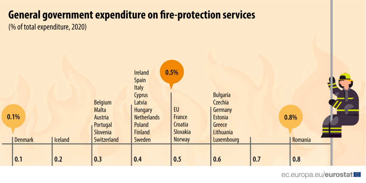 In contrast, Romania had the highest share of expenditure on fire protection services with 0.8%, followed by Bulgaria, Czech Republic, Germany, Estonia, Greece, Lithuania and Luxembourg with 0.6%.