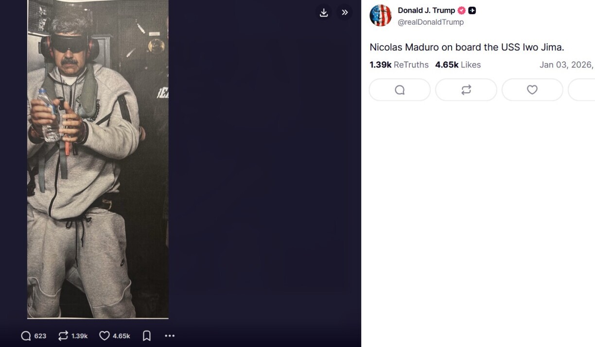 The 79-year-old Republican posted a picture of Maduro in custody on a US naval ship wearing a blindfold, handcuffs and what looked like noise-canceling ear muffs. He and his wife were being taken to New York to face narcotics and terrorism charges.