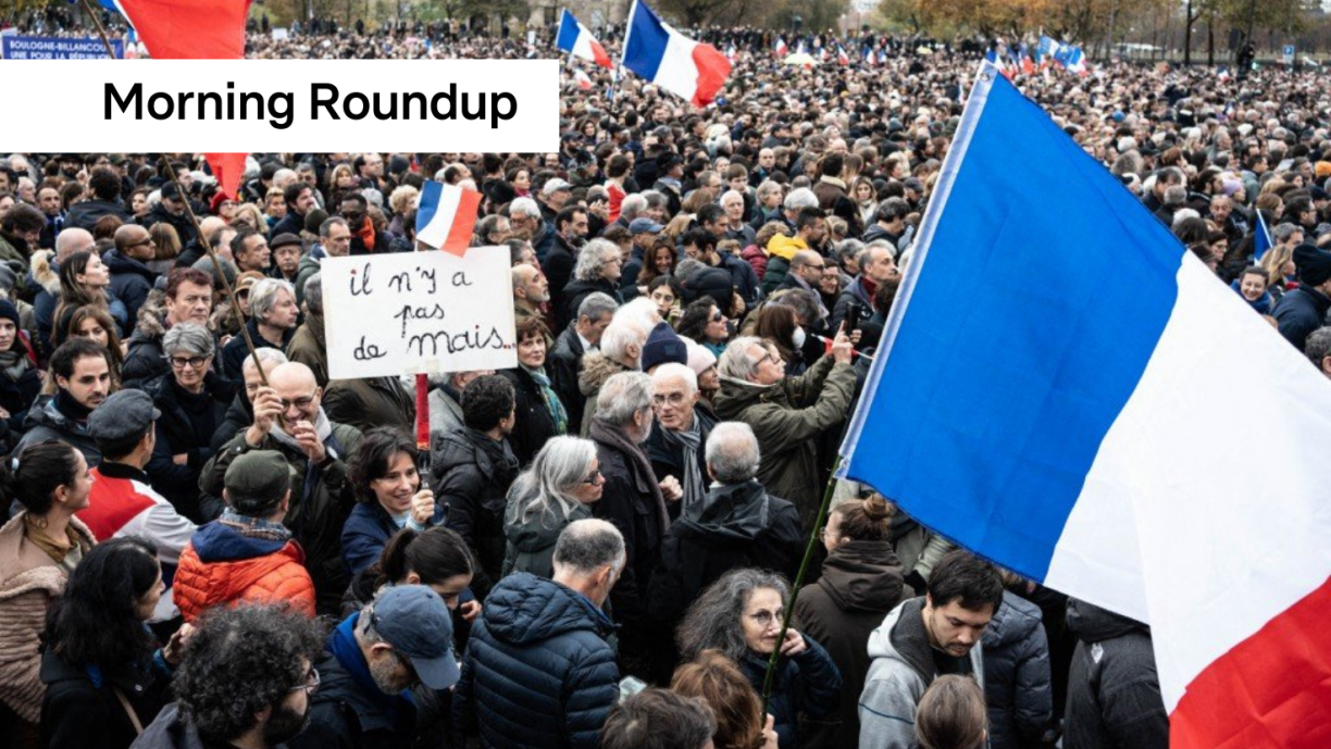 FRENCH MARCHES - More than 180,000 people turned out on Sunday to march against antisemitism in France, after a surge in anti-Jewish incidents across the country in the wake of the Israel-Hamas conflict. France has recorded nearly 1,250 anti-Semitic acts in recent weeks and President Emmanuel Macron - who did not attend Sunday - condemned the “unbearable resurgence of unbridled antisemitism”. Police said 105,000 people had joined the Paris march, while interior ministry figures put the nationwide figure at 182,000.