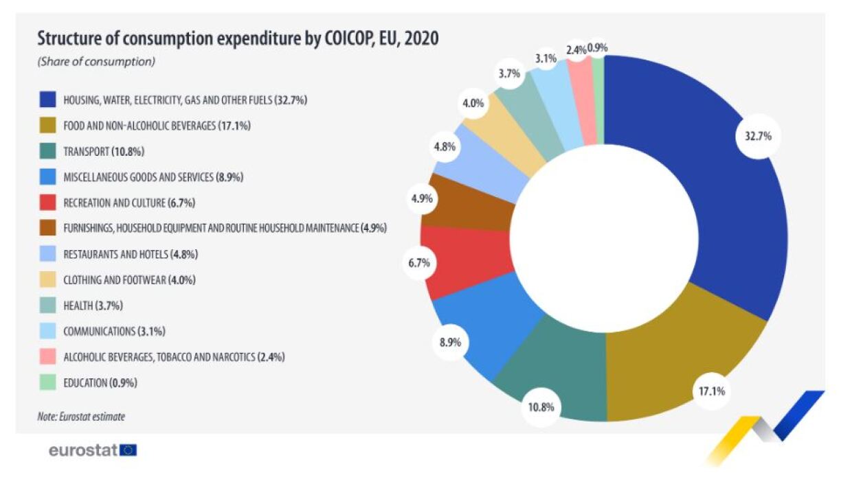 Further analysis reveals differences among countries. In the vast majority of countries, expenditure on housing, water, electricity, gas and other fuels represented the highest share of household expenditure. These shares ranged anywhere from 8.4% in Malta all the way to 49.2% in Hungary.