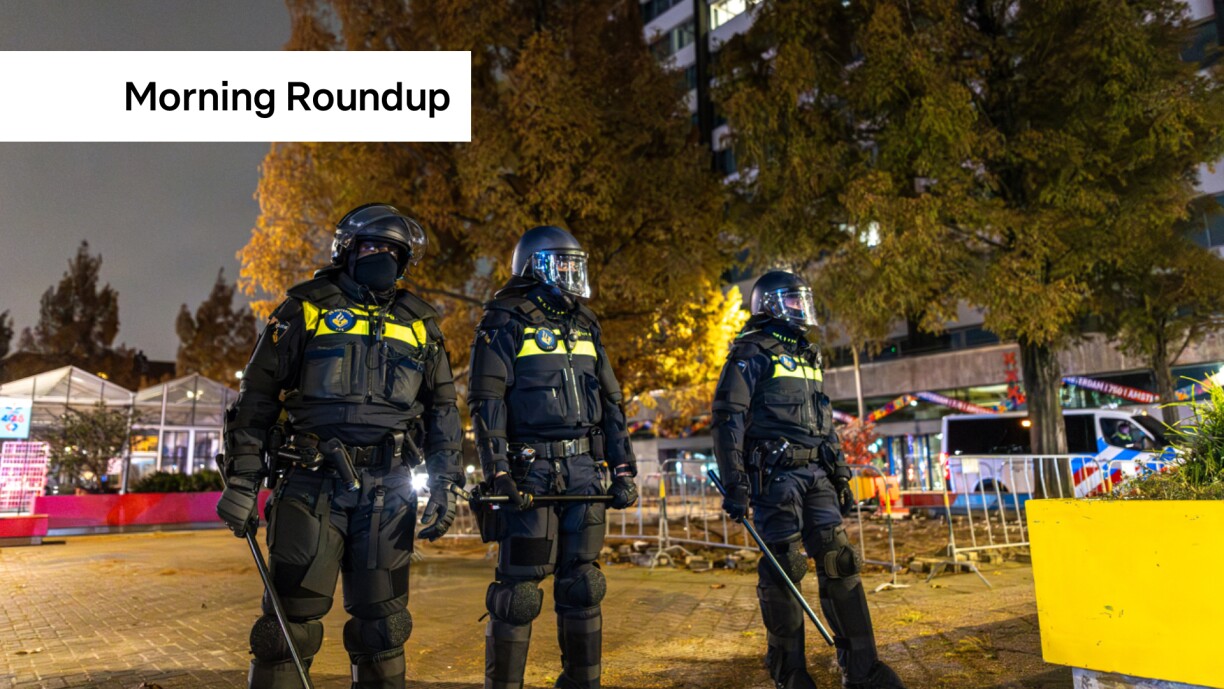 NETHERLANDS VIOLENCE – There was more unrest in Amsterdam last night. Dozens of people armed with sticks and firecrackers set fire to a tram and clashed with police. It is not clear whether the unrest is related to attacks on Israeli football fans last week. Noone was injured in last night’s violence. Meanwhile, Israel has urged fans to avoid Thursday’s France-Israel football game, which authorities fear could become a flashpoint following the violence in Amsterdam. Around 4,000 gendarmes will be on duty in Paris and the match is considered a “high security game”, which will also be attended by French President Emmanuel Macron.