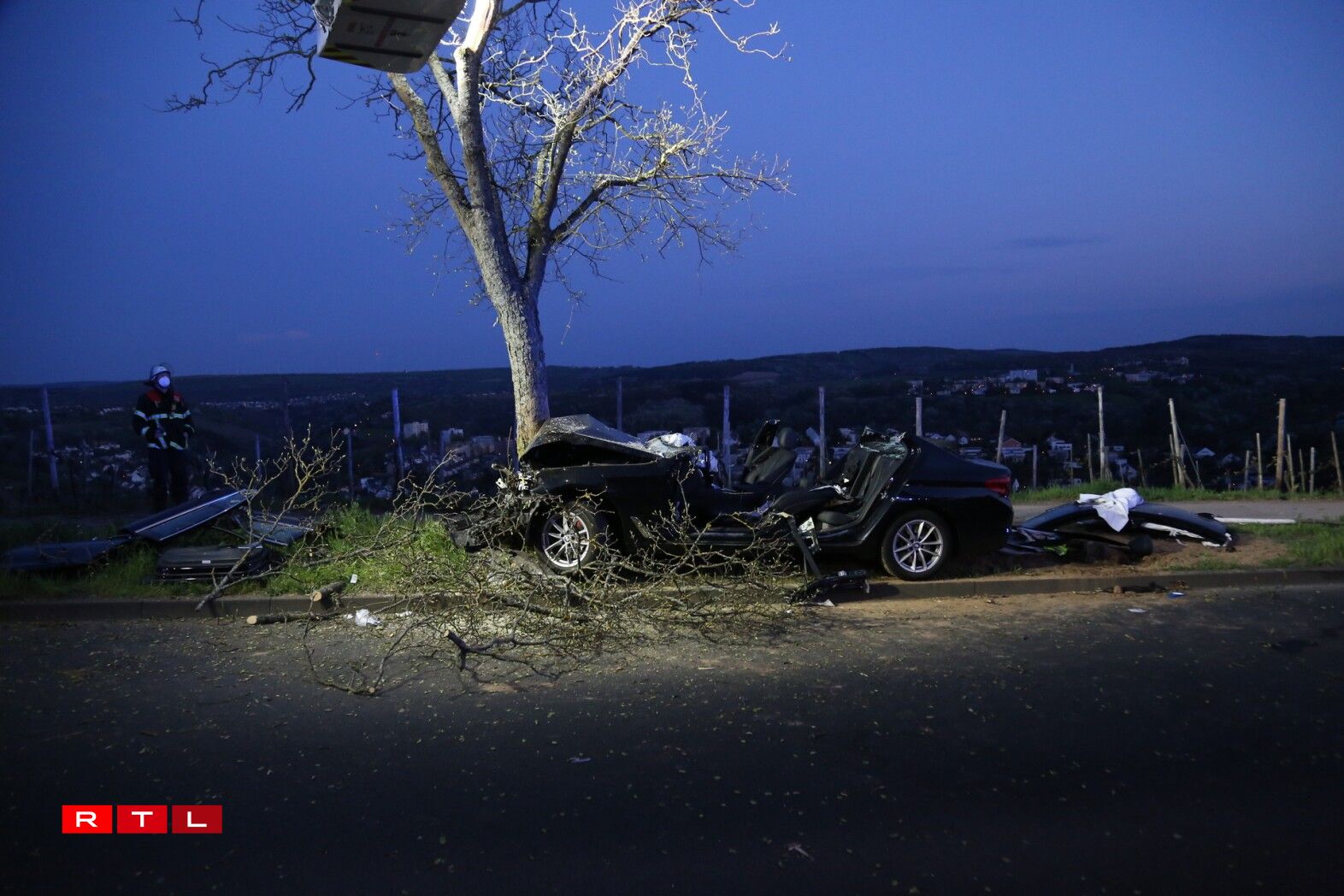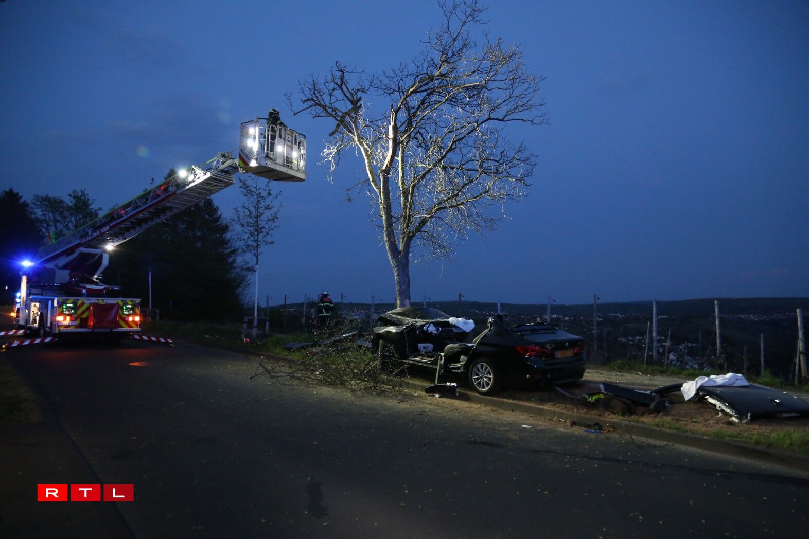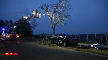 The driver of a Luxembourgish car seemingly skidded off the road and crashed head-on into a tree near Trier, Germany. Firefighters had to cut the car’s roof and doors to get the person out.