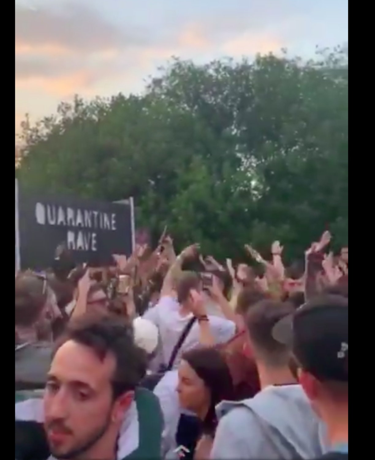 Footage from the second rave, near Oldham in eastern Manchester, shows thousands of party-goers dancing under a massive ‘Quarantine Rave’ sign.