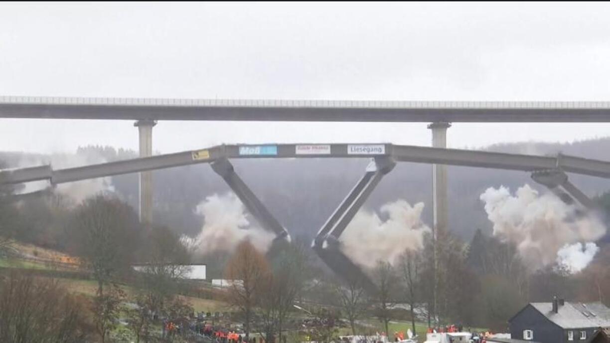 The nearby motorway section had to be closed off for safety reasons between ten o’clock in the morning and five in the afternoon. A blast zone was also set up to secure a 300-metre radius around the bridge. Curious onlookers were able to observe the detonation from far away or from the safety of their homes thanks to a live stream.