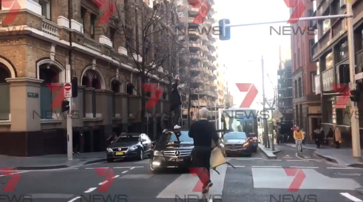 Images broadcast by Australian media showed the man jumping on the roof of a car brandishing a knife, appearing to shout “Allahu Akbar” and “shoot me”.